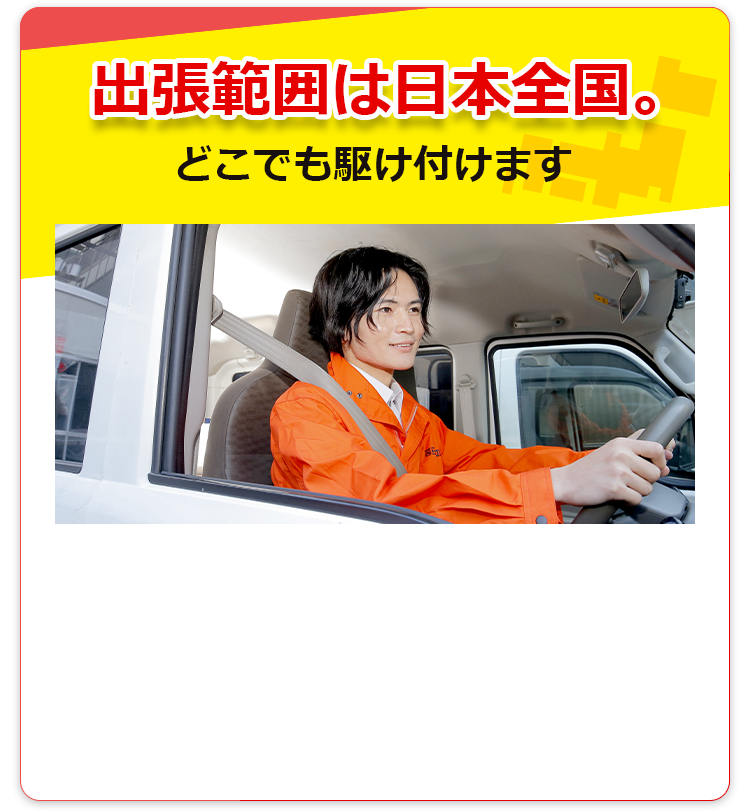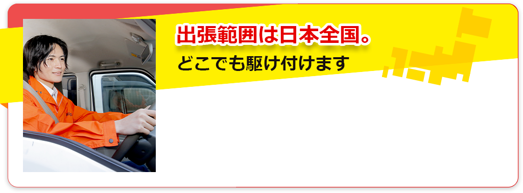 バッテリー110番は日本全国が出張範囲です。全国各地を巡回している自動車技師がいち早くトラブルを抱えたお客様の元へ駆け付けます。高速道路や山奥など通常では対応が難しい場所でも私たちが対応いたします。