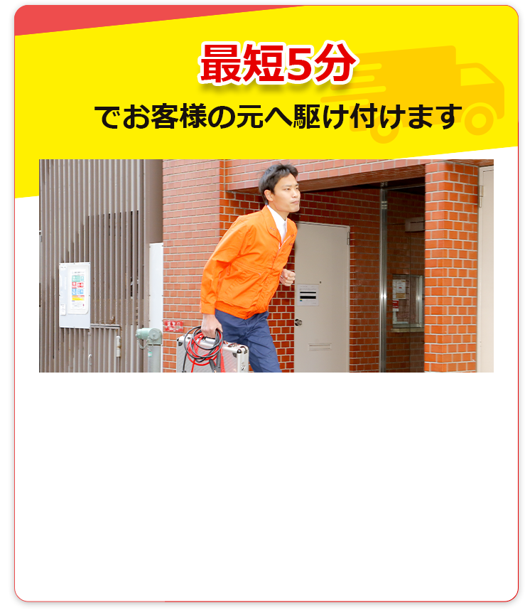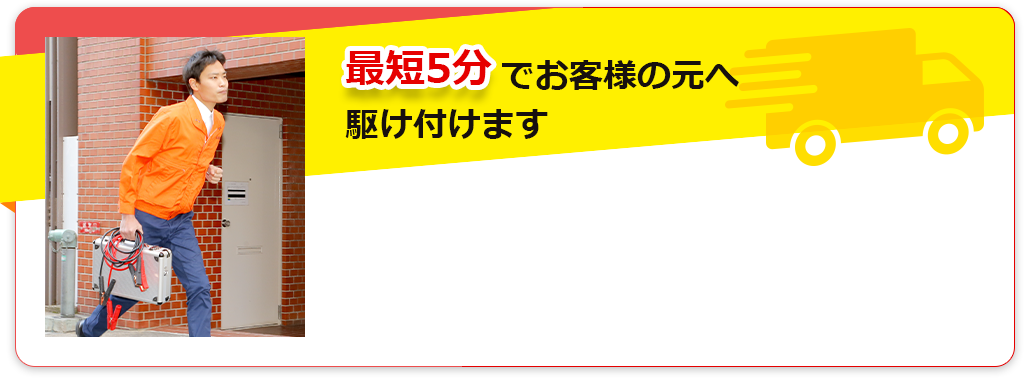 トラブルが起こった際、すぐにお客様の元へ駆け付けられるように日本全国を細かく自動車技師が巡回しています。近くにいる自動車技師をいち早く手配できるように、最新のAIシステムも導入しております。バッテリー110番だからこそできる最短5分の到着時間なのです。