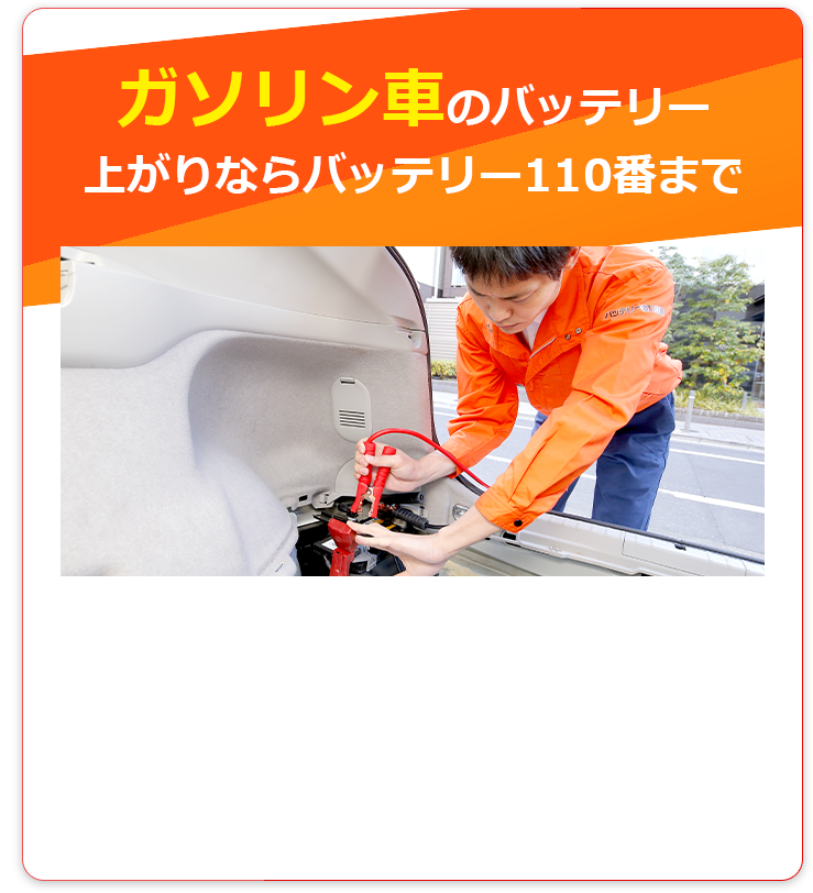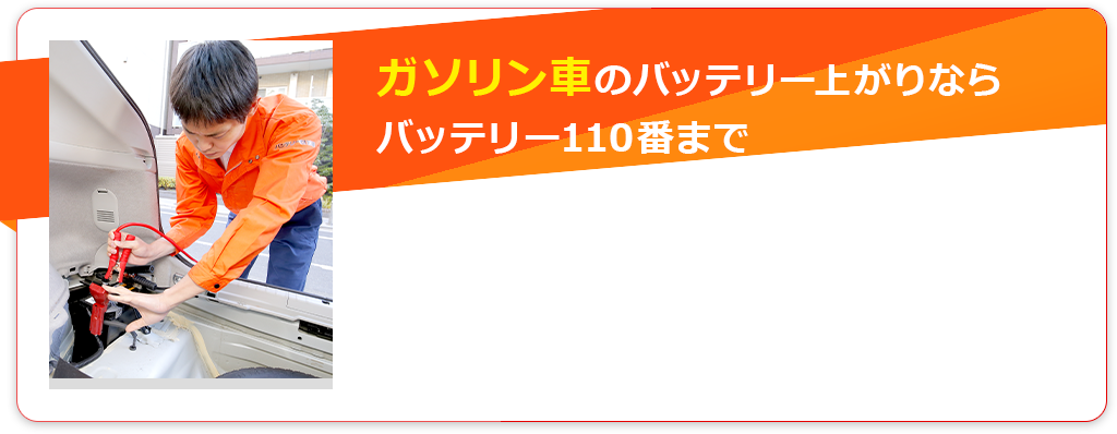 現在使われている多くの車はガソリン車です。そんなガソリン車のバッテリー上がりもバッテリー110番が解決いたします。車種や年代、排気量問わずバッテリー上がりを解決いたしますので、まずはお電話でオペレーターまでご相談ください。