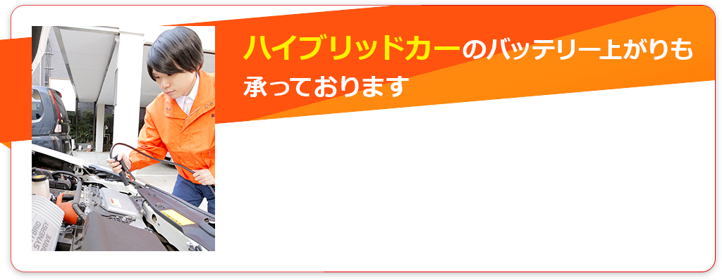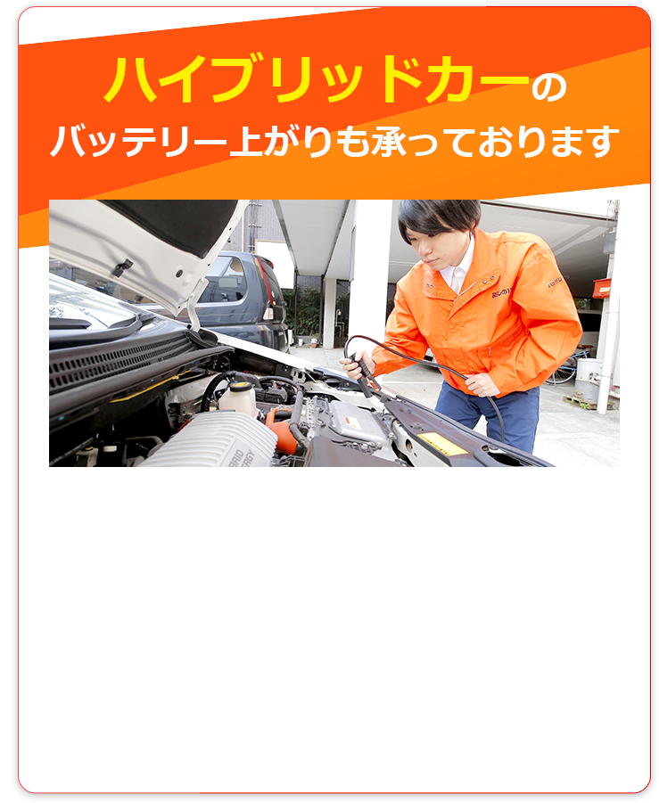 驚異の低燃費と地球環境への優しさから、近年ハイブリッドカーが普及しています。ハイブリッドカーは普通のガソリン車とは異なるバッテリーのため、普通は救済することができません。そんなハイブリッドカーもバッテリー110番にお任せください。最短5分で駆けつけてエンジンがかかるようにいたします。